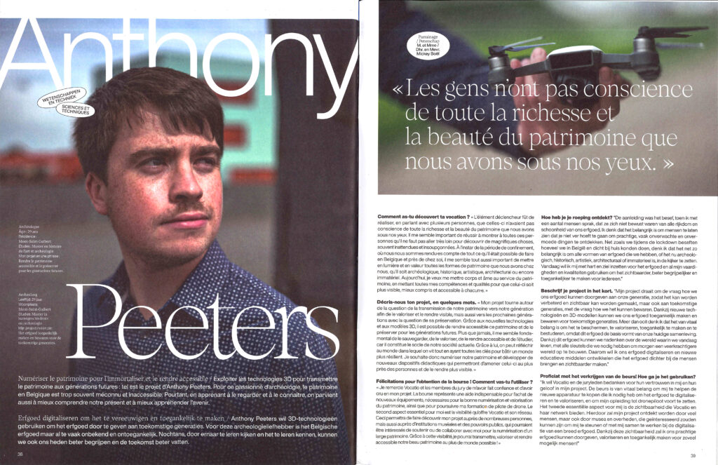 Le 13 juin 2024, Anthony Peeters a été récompensé par une bourse VOCATIO. Cette dernière, qui vise à soutenir les jeunes dans la poursuite de leur vocation, a été un des moteurs pour le lancement de l’ASBL Herit & Tech. En effet, elle récompense l’ambitieux projet d’Anthony Peeters autour de la numérisation du patrimoine belge, mobilier et immobilier. En exploitant les nouvelles technologies et la 3D, il est en effet aujourd’hui possible de rendre ce patrimoine accessible au plus grand nombre.